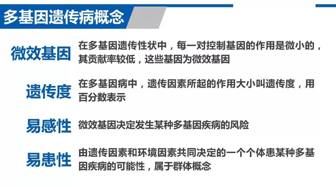 多基因遺傳病,指遺傳信息通過(guò)兩對(duì)及兩對(duì)以上致病基因的累積效應(yīng)所致的遺傳病,其遺傳效應(yīng)較多地受環(huán)境因素的影響,其又被稱(chēng)為復(fù)雜疾病。有關(guān)多基因遺傳病的幾個(gè)關(guān)鍵概念如下: