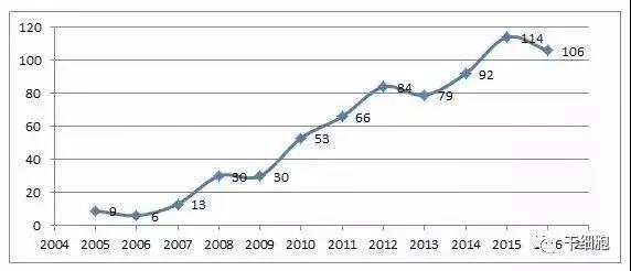 表1 2005年-2017年間充質(zhì)干細(xì)胞臨床研究變化趨勢(shì)