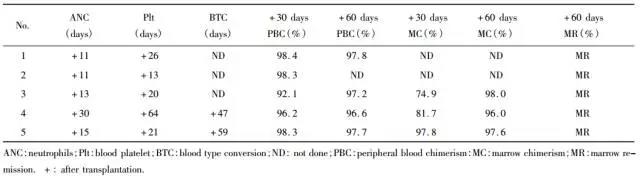 蘇州大學(xué)附屬第一醫(yī)院為異基因造血干細(xì)胞移植后出現(xiàn)aGVHD的5位白血病患兒輸注臍帶間充質(zhì)干細(xì)胞,輸注10天后,5位患兒均獲造血重建,皮疹消退, 肝功能恢復(fù)正常, 胃腸道癥狀好轉(zhuǎn) ,患兒均未發(fā)生輸注相關(guān)不良反應(yīng)。目前患兒均無(wú)原發(fā)病的復(fù)發(fā), 均處于無(wú)病生存狀態(tài)(表4) 。