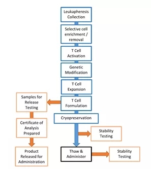 自體回輸?shù)腃AR-T制備工藝經(jīng)過:T細(xì)胞采集及儲存-T細(xì)胞的富集-T細(xì)胞激活-T細(xì)胞轉(zhuǎn)導(dǎo)修飾-T細(xì)胞擴(kuò)增-成品CAR-T儲存等。質(zhì)量控制和檢測環(huán)節(jié)貫穿整條工藝線。在整個(gè)工藝流程中,有幾個(gè)關(guān)鍵環(huán)節(jié)和關(guān)鍵指標(biāo)需要注意。以下分析的基礎(chǔ)為已上市的兩款CAR-T產(chǎn)品和中國食品藥品檢定研究院發(fā)布的CAR-T的生產(chǎn)考慮要點(diǎn)。
