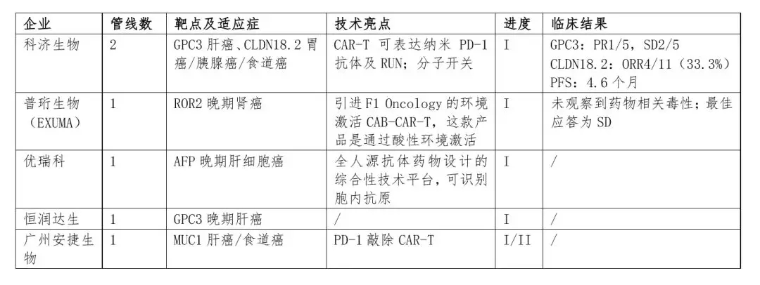 表6 國內(nèi)獲得實(shí)體瘤CAR-T臨床批件的企業(yè)
