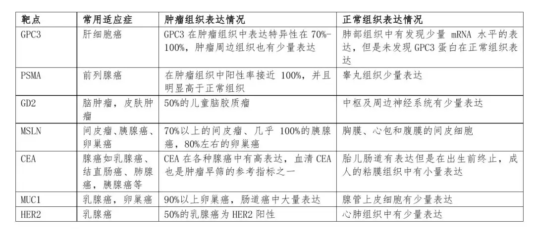 不像血液瘤中CD19表達(dá)于所有B細(xì)胞表面,實(shí)體瘤的抗體選擇更為復(fù)雜。常見的實(shí)體瘤靶點(diǎn)有HER2,CEA,EGFR,GD2,PSMA,Mesothelin,MUC1等都是腫瘤相關(guān)性靶點(diǎn),在腫瘤中高表達(dá),在正常組織中也有少量的表達(dá)。比如HER2靶點(diǎn)廣泛出現(xiàn)在乳腺癌中,但是在正常的心肺組織中,也有少量表達(dá)。曾有有患者接受了靶向HER2的CAR-T治療,在5天之后,因?yàn)镃AR-T誘導(dǎo)的心肺功能衰竭而死亡。實(shí)體瘤靶點(diǎn)有EGFR/EGFRvIII,HER2,CEA,MSLN,F(xiàn)AP,cMet,GPC3,GD2,MUC1,L1-CAM等。