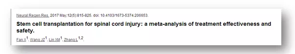 發(fā)表在《Neural Regen Res.》雜志上的論文分析了10項囊括干細胞治療377名脊髓損傷患者的研究,結果表明,干細胞移植治療脊髓損傷可以改善感覺功能和膀胱功能,同時具有修復的功能,可以初步認為是有效的。