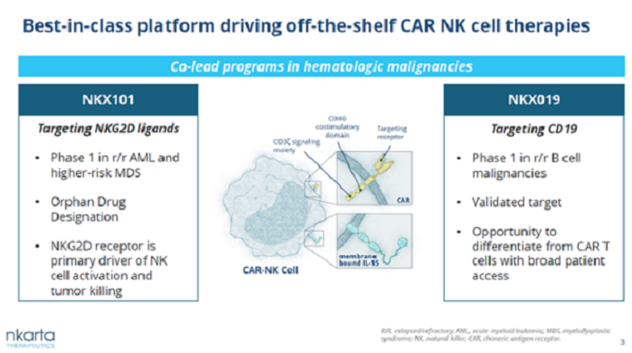 NKX101和NKX019是兩款同種異體的即用型NK細(xì)胞療法。使用從健康供體中獲得的外周血NK細(xì)胞,并利用生物工程添加CAR。NKX101的CAR靶向腫瘤表面的NKG2D配體。NKG2D是NK細(xì)胞的關(guān)鍵性激活受體,其配體在癌癥細(xì)胞中過度表達(dá)。NKX019的CAR靶向腫瘤表面的CD19,這是已經(jīng)被臨床驗(yàn)證的靶點(diǎn)。除了CAR之外,這些候選療法還表達(dá)與細(xì)胞膜結(jié)合的IL-15,用于增強(qiáng)細(xì)胞的持久性和活性。