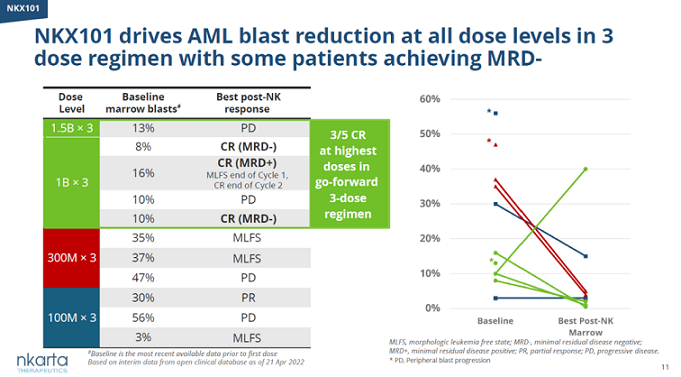 在評估NKX101治療復(fù)發(fā)/難治性急性髓系白血?。ˋML)和骨髓增生異常綜合癥(MDS)的臨床試驗(yàn)中,接受更高劑量NKX101的3劑治療方案治療的5名AML患者中3名獲得完全緩解,其中兩名患者達(dá)到最小殘余病灶(MRD)陰性標(biāo)準(zhǔn)。