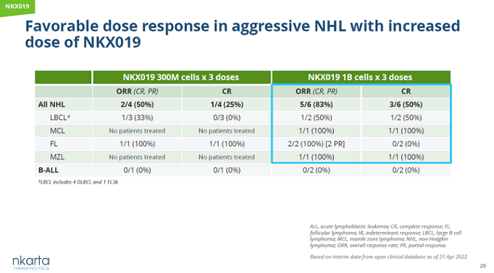 在評估NKX019治療復(fù)發(fā)/難治性B細(xì)胞癌癥的臨床試驗(yàn)中,接受更高劑量NKX019的3劑給藥方案治療的6名患者中3名患者達(dá)到完全緩解,其中包括一名彌漫性大B細(xì)胞淋巴瘤患者和一名套細(xì)胞瘤患者。