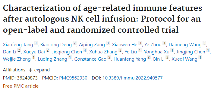 2022年9月,上海長征醫(yī)院輸血科、上海交通大學免疫學研究所等單位聯(lián)合在《Frontiers in Immunology》上發(fā)表了一篇名為“Characterization of age-related immune features after autologous NK cell infusion: Protocol for an open-label and randomized controlled trial”的研究結(jié)果表明,自體NK細胞能夠顯著改善T細胞衰老和耗竭。